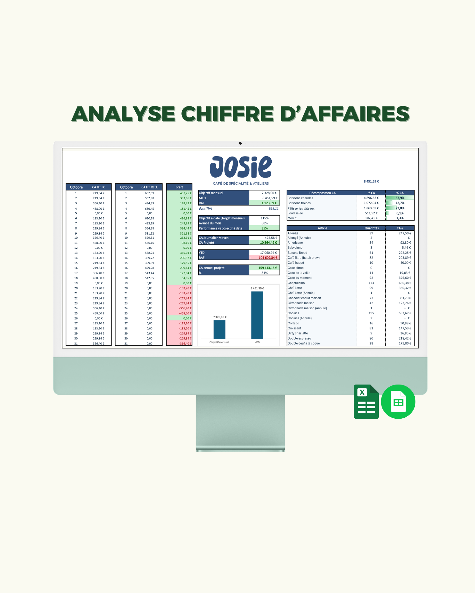 Un fichier intelligent composé de 6 onglets d’analyse, entièrement personnalisé pour votre café ou restaurant, afin de vous offrir une vision claire, concrète et stratégique de votre performance.